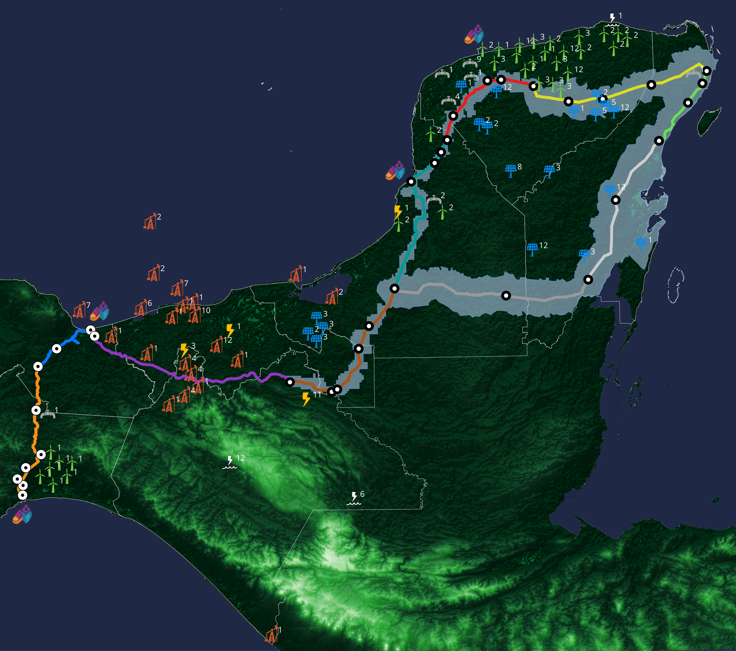 Existen 75 proyectos extractivos en el sureste mexicano que se beneficiarán con el Tren Maya porque abarata costos de movilidad, logística y transporte de personas y materia prima. El 70% de los ingresos del Tren Maya será por transporte de carga, especialmente de combustibles. Además, se unirá con el otro megaproyecto estrella de AMLO, el Corredor Interoceánico del Istmo de Tehuantepec conformando una red de infraestructura que busca hacer más eficiente la cadena de suministros y así promover la indutrialización, la hiperurbanización y la profundización del extractivismo. Todo esto con el objetivo de gestionar los territorios del sur para controlar el patrimonio natural de la región y también los flujos migratorios. Ambos proyectos conformarán un muro de contención y frontera extendida (serán “cortinas de desarrollo”). Como se ve en el mapa las empresas mineras, petroleras y energéticas nacionales y transnacionales serán las beneficiarias de este modelo de gestión territorial y de desarrollo del sureste impulsado por el gobierno federal y gestionado por los militares.