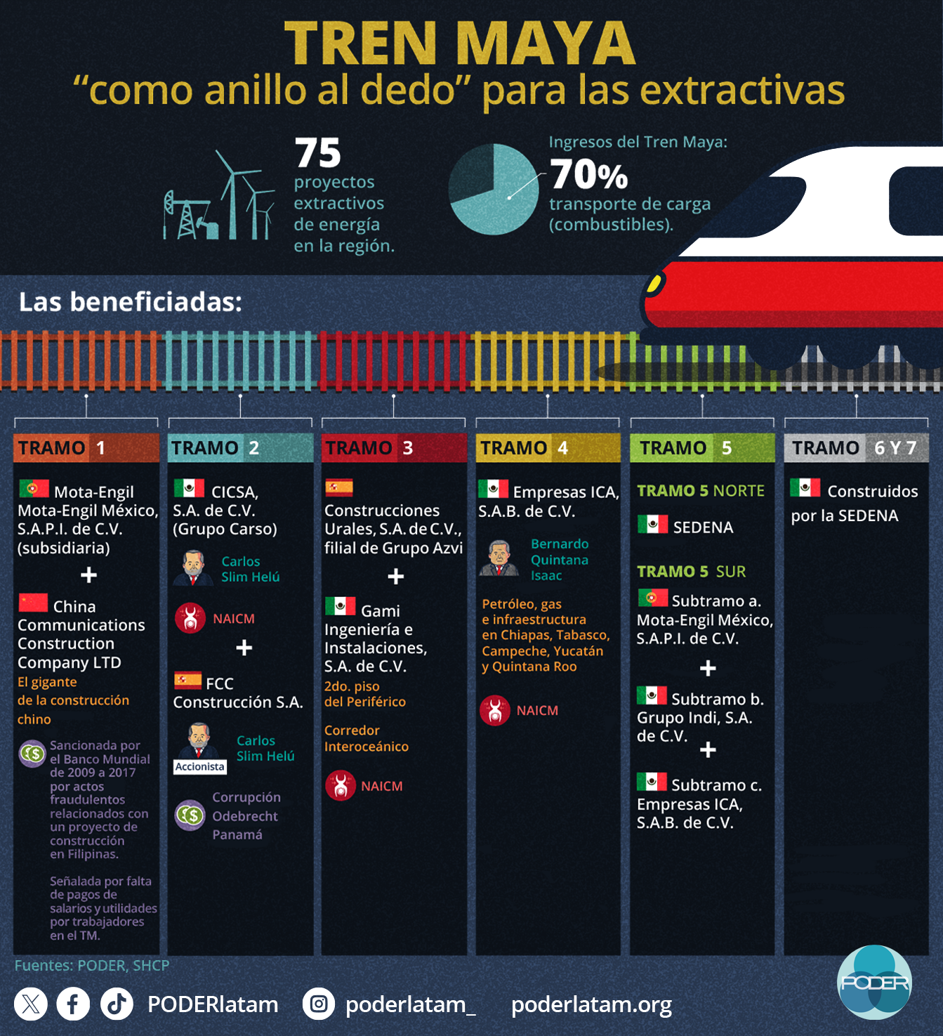 Las empresas beneficiadas para la construcción de la vía férrea que atravesará los estados de Campeche, Tabasco, Chiapas, Yucatán y Quintana Roo son, para el Tramo 1, el consorcio LAMAT, creado por Mota-Engil junto con una de las mayores constructoras asiáticas, China Communications Construction Company LTD, involucrada en actos fraudulentos en Filipinas. El Tramo 2 es de CICSA, de Grupo Carso, propiedad de Carlos Slim junto con la española FCC Construcción (Slim es accionista también). Esta última fue imputada en Panamá por actos de corrupción vinculados a Odebrecht. El Tramo 3 fue otorgado al consorcio Azvindi Ferroviario, creado por GAMI de Grupo Indi, de Manuel G. Muñozcano y Grupo Azvi, S.L. y su filial Construcciones Urales, S.A. de C.V. El Tramo 4 fue adjudicado a ICA de Bernardo Quintana. Los tramos 5, 6 y 7 están a cargo de la SEDENA que ha subcontratado a algunas empresas que ya participaban en la construcción del tren. La falta de transparencia es total en los tramos controlados por SEDENA ya que a cualquier solicitud de información la niegan argumentando cuestiones de seguridad nacional.